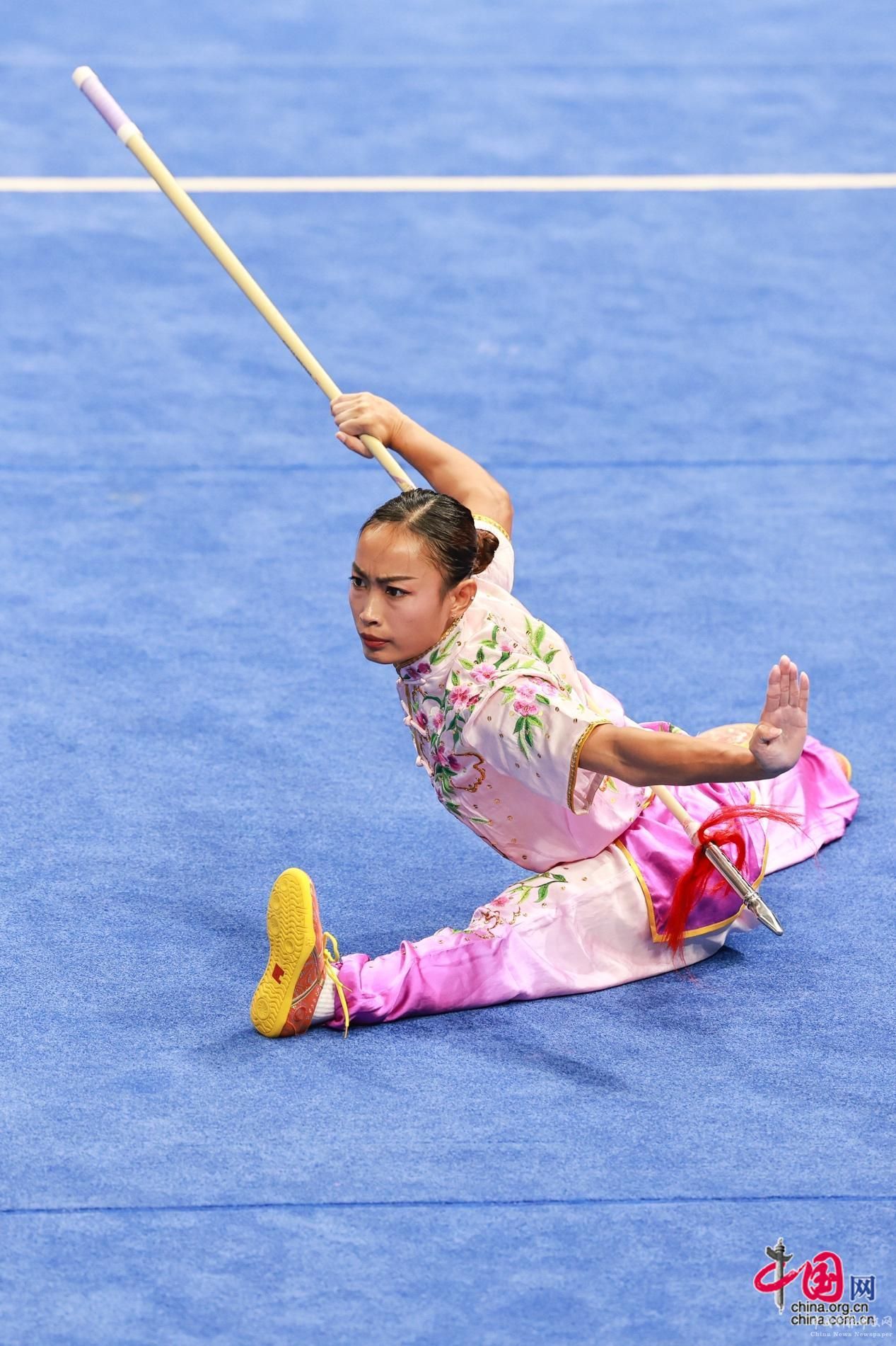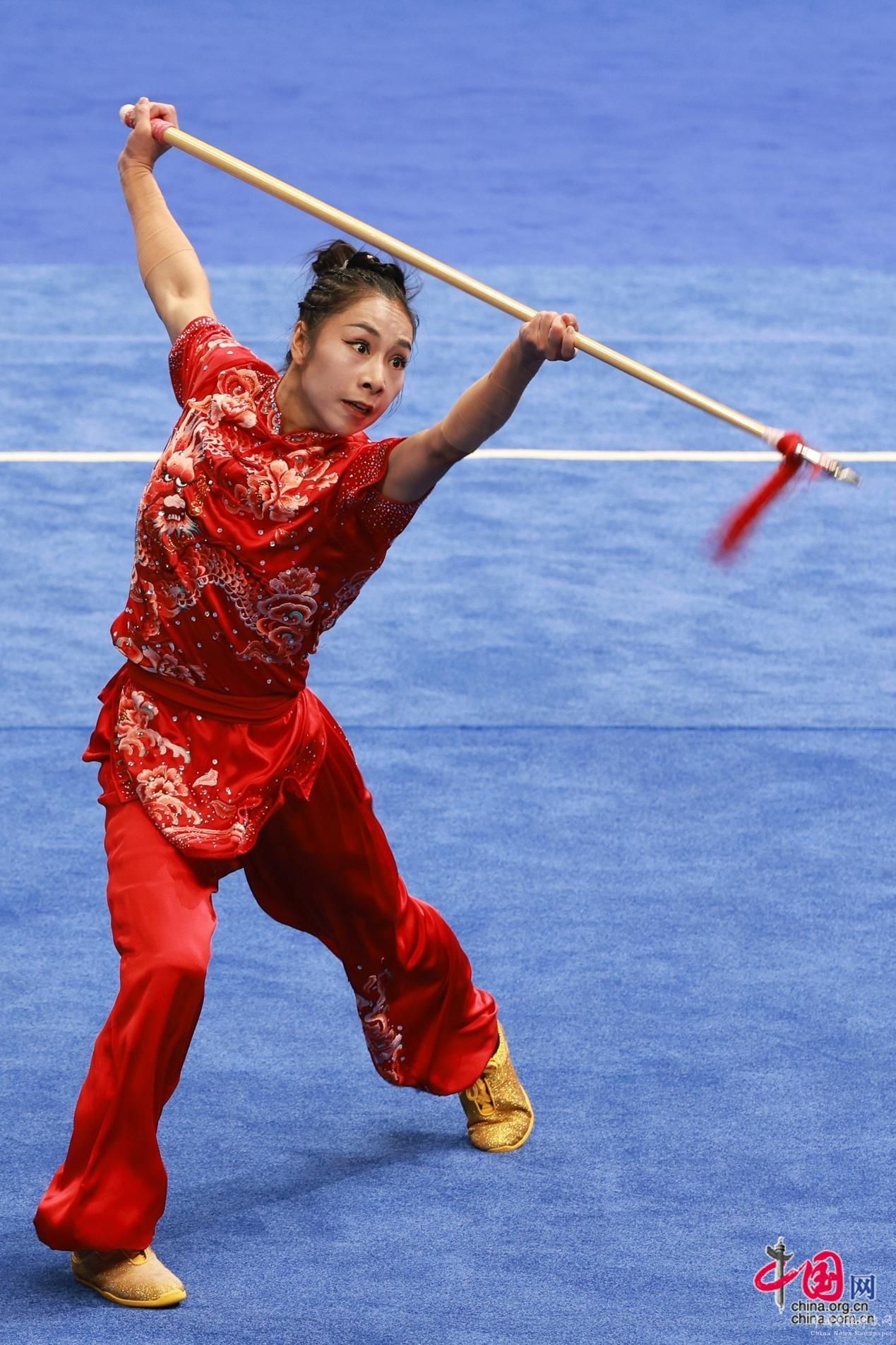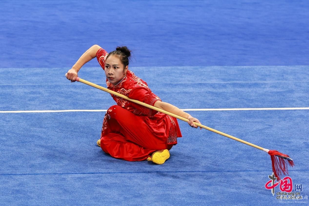 9月27日,杭州第19屆亞運(yùn)會(huì)武術(shù)女子劍術(shù)槍術(shù)全能決賽在蕭山瓜瀝文化體育中心舉行,中國(guó)選手賴(lài)曉曉19.6分的優(yōu)異成績(jī)摘取桂冠。圖為槍術(shù)決賽現(xiàn)場(chǎng)。中國(guó)網(wǎng)記者 董寧 攝影