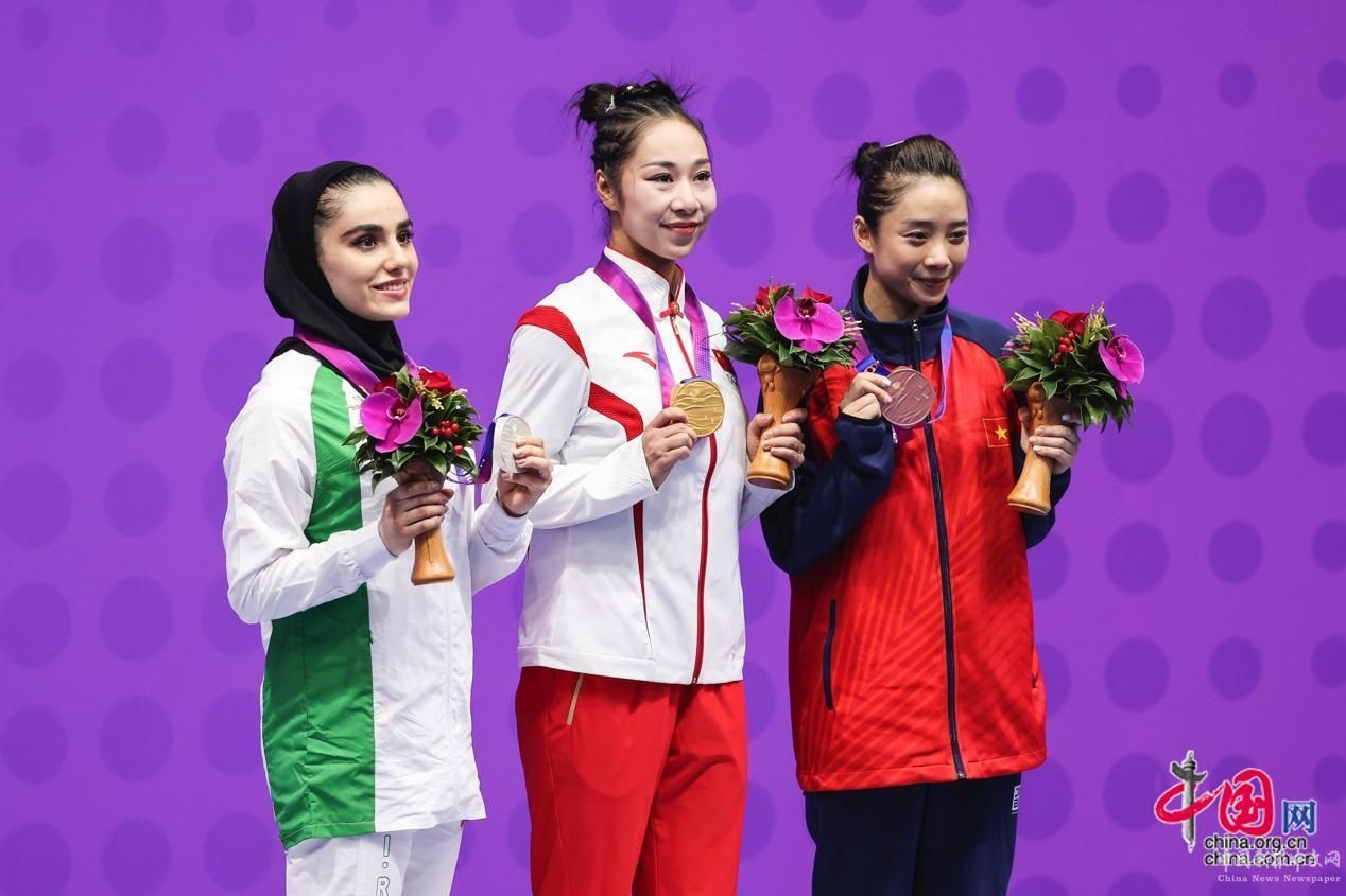 9月27日,杭州第19屆亞運(yùn)會(huì)武術(shù)女子劍術(shù)槍術(shù)全能決賽在蕭山瓜瀝文化體育中心舉行,中國(guó)選手賴(lài)曉曉19.6分的優(yōu)異成績(jī)摘取桂冠。圖為獲獎(jiǎng)選手在領(lǐng)獎(jiǎng)臺(tái)合影。中國(guó)網(wǎng)記者 董寧 攝影