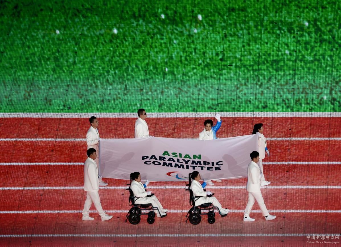 10月22日,亞殘奧委員會(huì)會(huì)旗在開幕式上入場(chǎng)。中國(guó)日?qǐng)?bào)記者 魏曉昊 攝