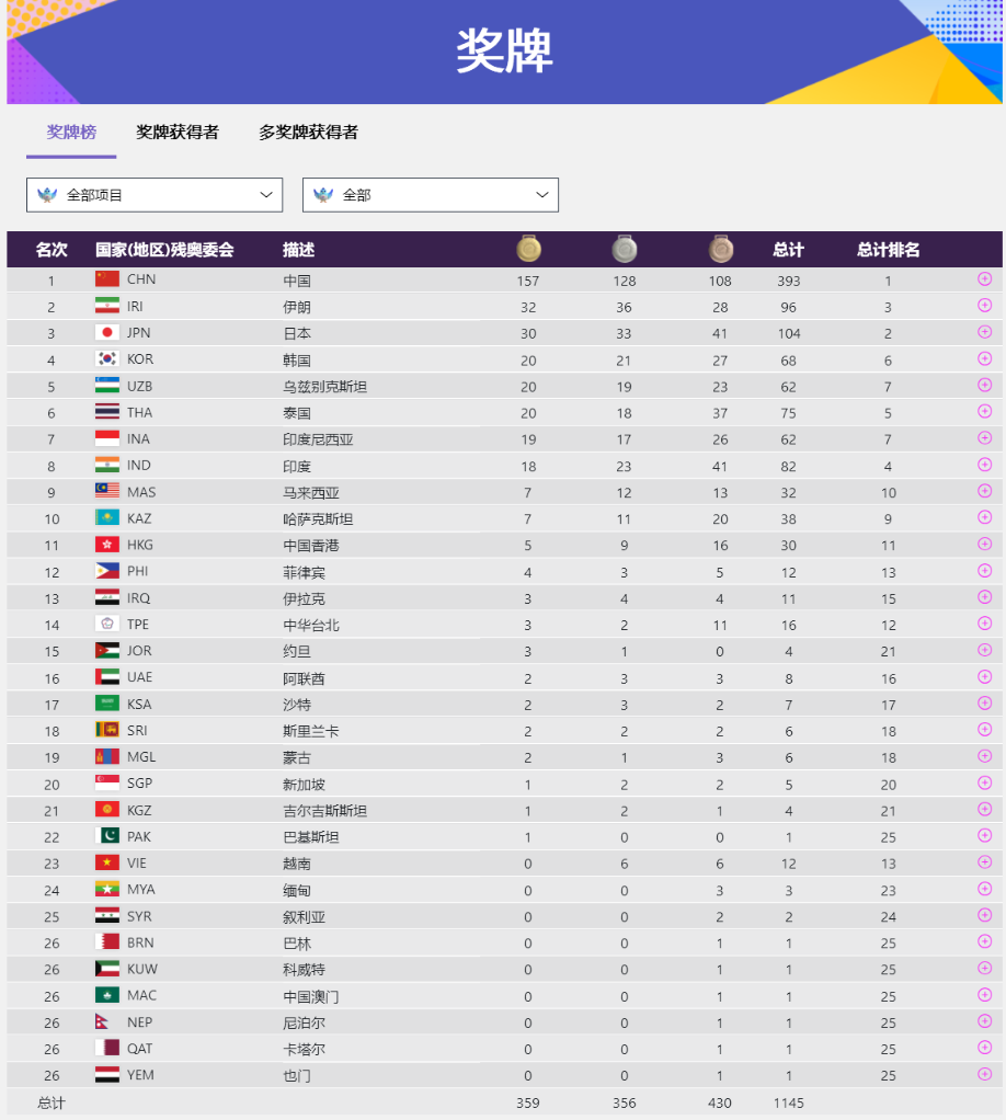 截至26日,中國(guó)隊(duì)在獎(jiǎng)牌榜上以157金128銀108銅高居榜首,伊朗隊(duì)和日本隊(duì)分別以32金和30金排在二、三位。