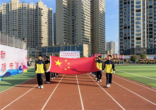 開幕式上,在激昂的運(yùn)動(dòng)員進(jìn)行曲中,國(guó)旗護(hù)衛(wèi)隊(duì)緩緩入場(chǎng)。國(guó)旗、校旗、奧運(yùn)旗、會(huì)旗隊(duì)、吉祥物方陣、鼓樂(lè)方陣邁著矯健的步伐,以口號(hào)、動(dòng)作、道具等形式展現(xiàn)班級(jí)特色的72個(gè)方陣依次通過(guò)大會(huì)前臺(tái)進(jìn)入運(yùn)動(dòng)場(chǎng)。同學(xué)們口號(hào)聲,整齊的步伐聲交織成一片歡騰的海洋。千人課桌操、百人跑操等節(jié)目逐一上演。