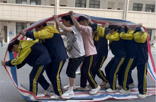 莊嚴(yán)、雄壯的國(guó)歌聲響起,以學(xué)生為底座,以人梯為旗桿,9名少先隊(duì)員托舉一面鮮艷的五星紅旗步行至旗桿頂端。“學(xué)校團(tuán)體操表演,五星紅旗升起時(shí)讓人熱血沸騰!”觀看家長(zhǎng)代表感嘆道:“進(jìn)度條100%!”