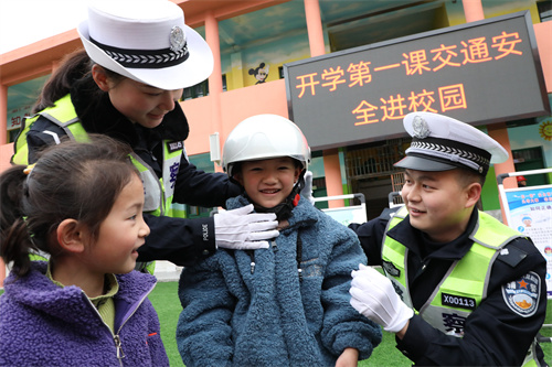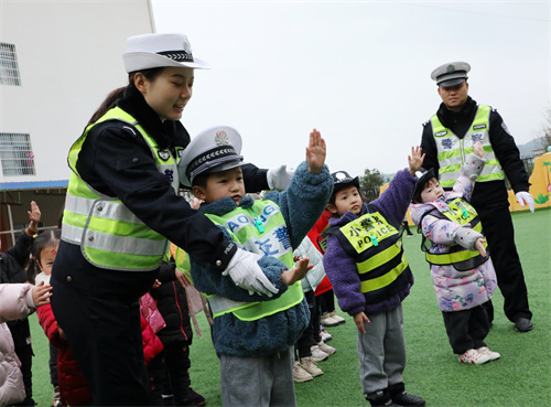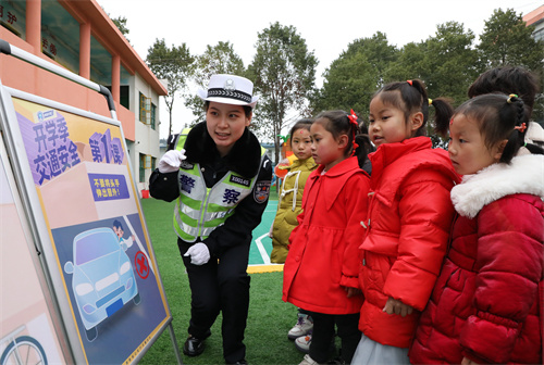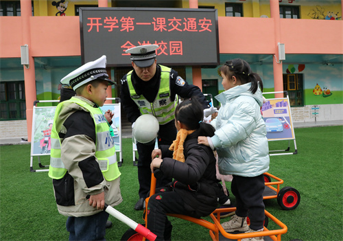 2月10日,在湖南省保靖縣清水坪學(xué)校幼兒園,交警給小朋友講解交通安全知識。當(dāng)日是保靖縣中小學(xué)春季開學(xué)第一天,該縣公安局交警大隊組織交警深入多所中小學(xué)開展“文明交通宣傳進校園”活動。交警們通過現(xiàn)場講解、展板展示、現(xiàn)場互動等方式,為學(xué)生普及交通安全知識,以增強少年兒童交通安全意識和自我保護能力。( 俞采華 彭  博)