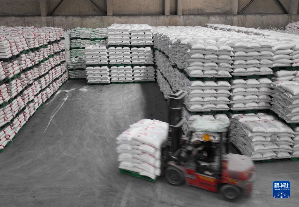2月16日,在貴州省貴陽(yáng)市開(kāi)陽(yáng)縣一家化肥生產(chǎn)企業(yè),工人駕駛叉車(chē)轉(zhuǎn)運(yùn)準(zhǔn)備外銷(xiāo)的化肥(無(wú)人機(jī)照片)。