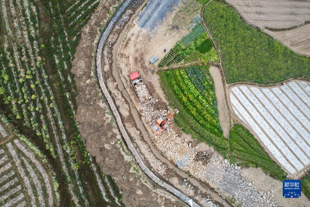 2月16日,工人在貴州省羅甸縣逢亭鎮(zhèn)腮里村治理河道,為春耕生產(chǎn)灌溉做準(zhǔn)備(無(wú)人機(jī)照片)。
