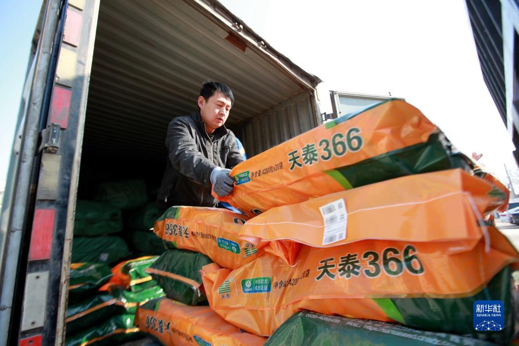 2月16日,在山東省臨沂市平邑縣一家種業(yè)公司,工人將玉米種裝車(chē)外運(yùn)。
