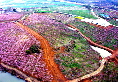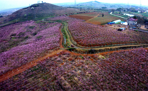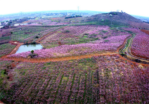 2023年3月18日,安徽省合肥市廬江縣冶父山鎮(zhèn)明圣村黃桃種植基地,粉紅色的桃花迎風盛開,將鄉(xiāng)村裝扮得如同畫里春天。