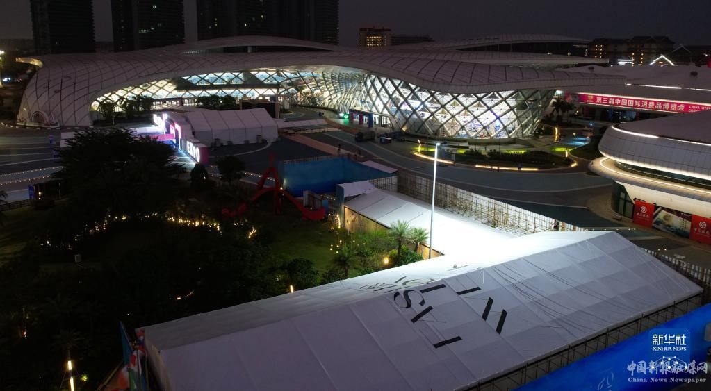 夜色中的第三屆中國(guó)國(guó)際消費(fèi)品博覽會(huì)舉辦地海南國(guó)際會(huì)展中心(4月6日攝,無(wú)人機(jī)照片)。