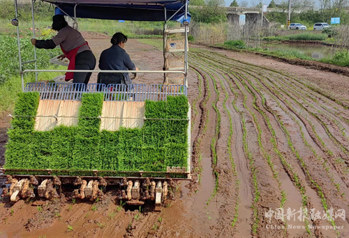 在早稻示范區(qū),首批秧苗機(jī)插工作正式開始,隨著轟鳴的機(jī)器聲,一簇簇嫩綠的秧苗被整齊有序地栽插進(jìn)水田中。