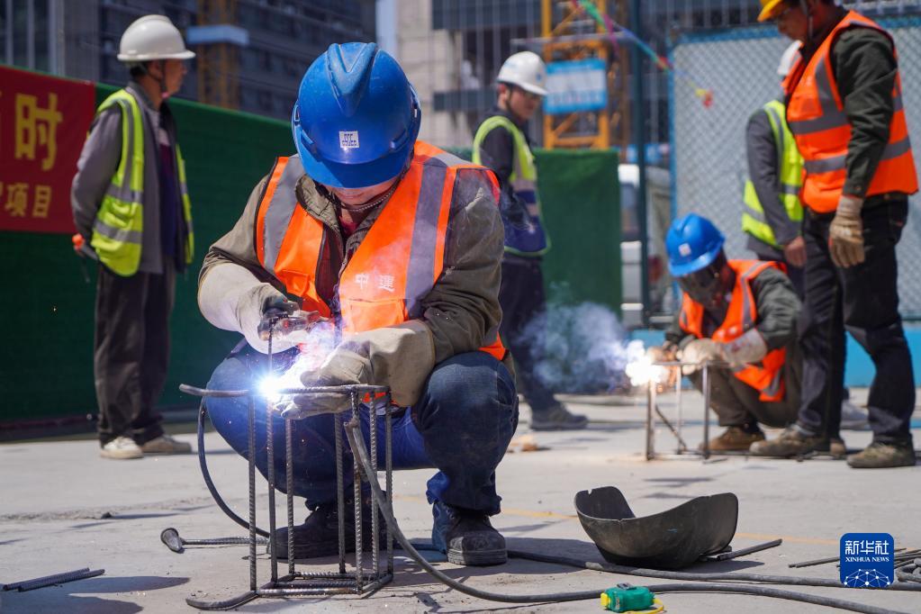 4月27日,在江蘇南京華貿(mào)項(xiàng)目施工現(xiàn)場(chǎng),建設(shè)者代表在中建三局浙江公司組織的“技能大比武”活動(dòng)中參加鋼筋焊接比賽。