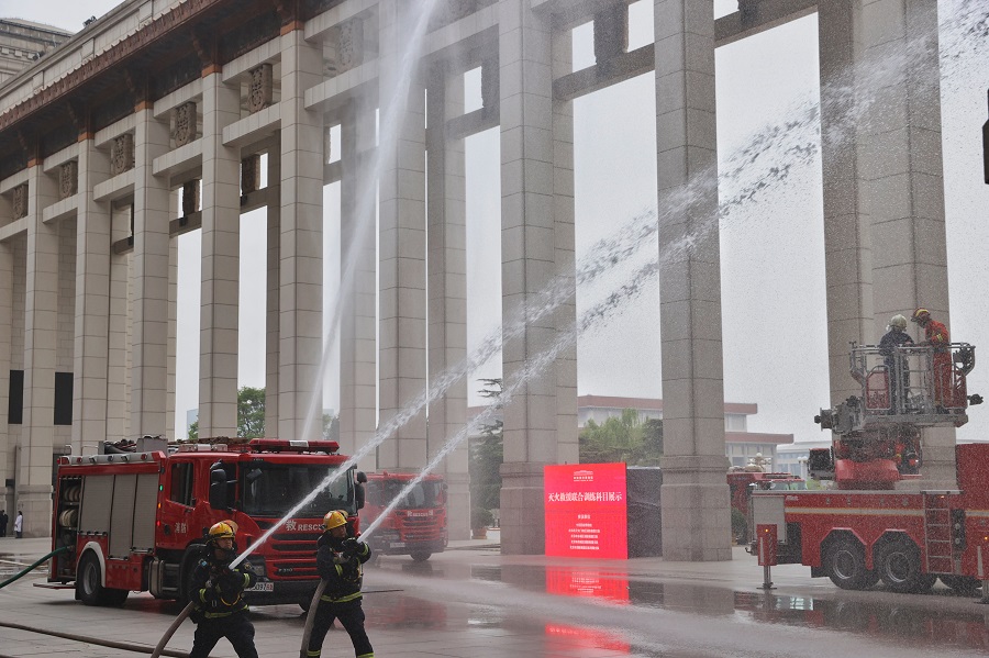 4月27日,消防人員進行實戰(zhàn)操法技能展示。中國日報記者 姜東 攝
