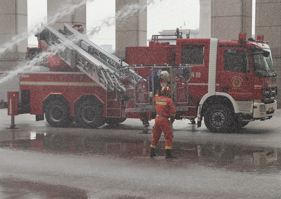 4月27日,消防人員進行滅火演練。中國日報記者 姜東 攝