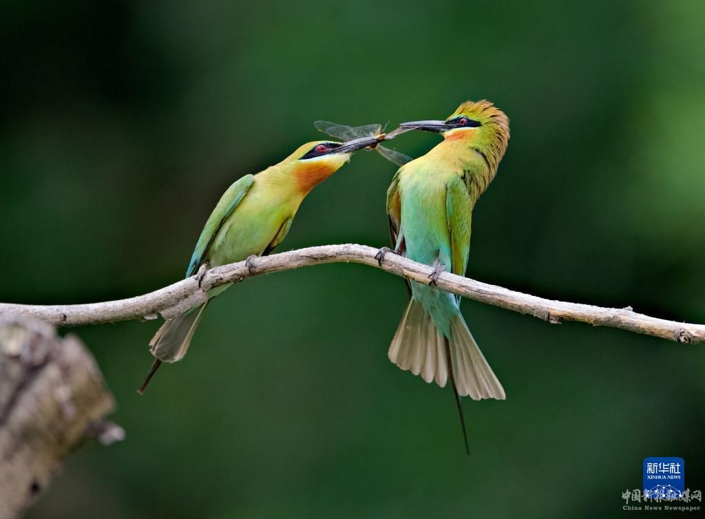 5月20日,雄鳥(右)在給雌鳥喂飼昆蟲。