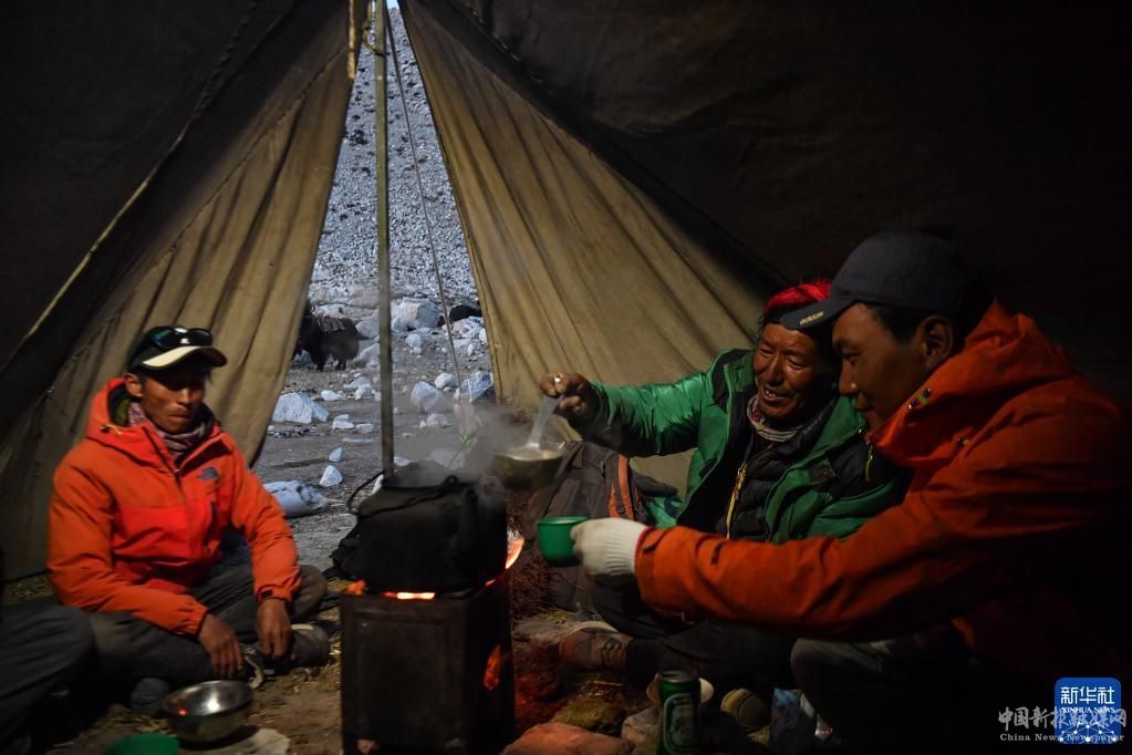 在珠峰登山大本營(yíng)附近的帳篷里,牦牛工燒水煮茶(5月17日攝)。