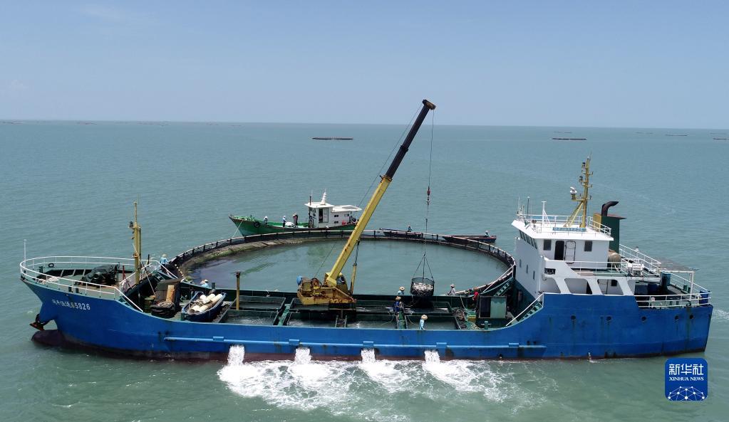 5月27日,在湛江市徐聞縣西連鎮(zhèn),漁業(yè)工人從徐聞國(guó)橋深海養(yǎng)殖有限公司的金鯧魚深海網(wǎng)箱捕魚(無(wú)人機(jī)照片)。