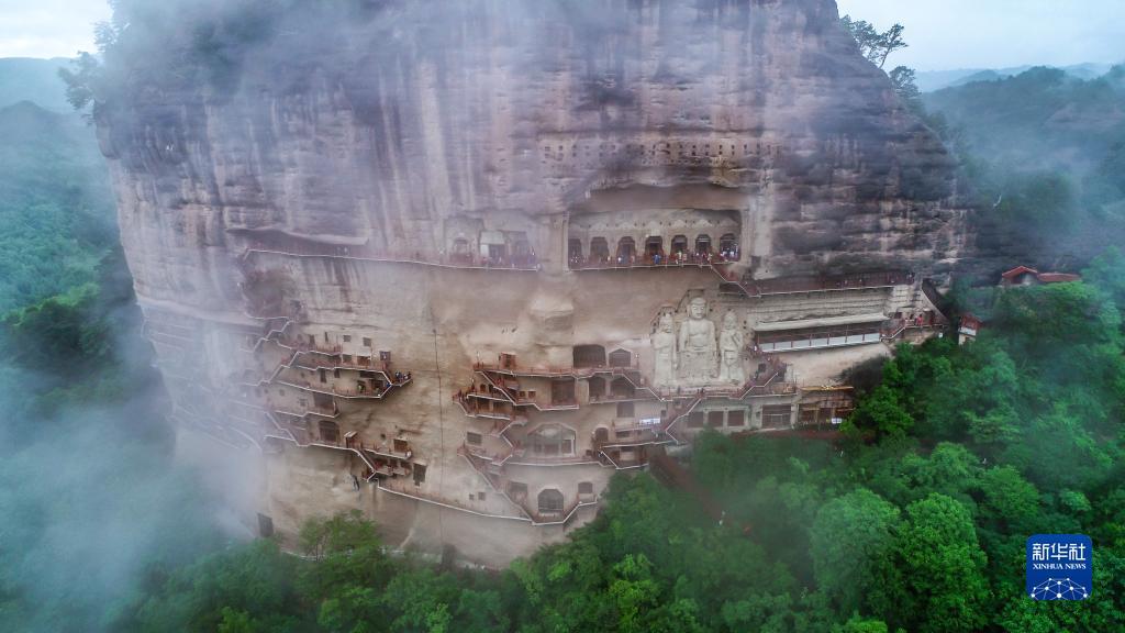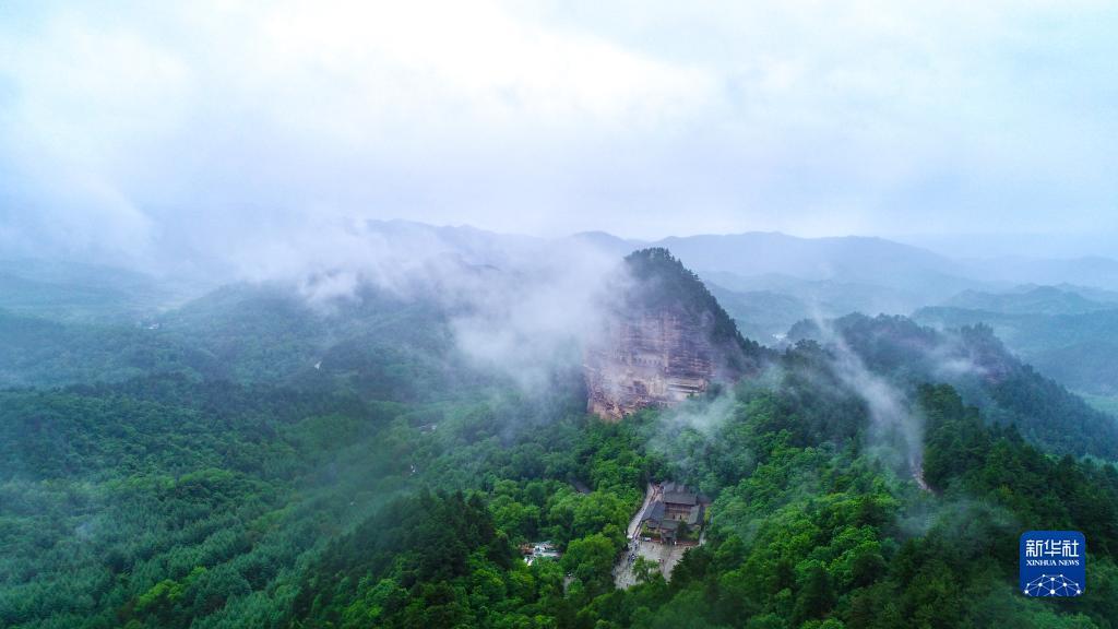 這是5月31日拍攝的煙雨籠罩下的麥積山石窟(無(wú)人機(jī)照片)。