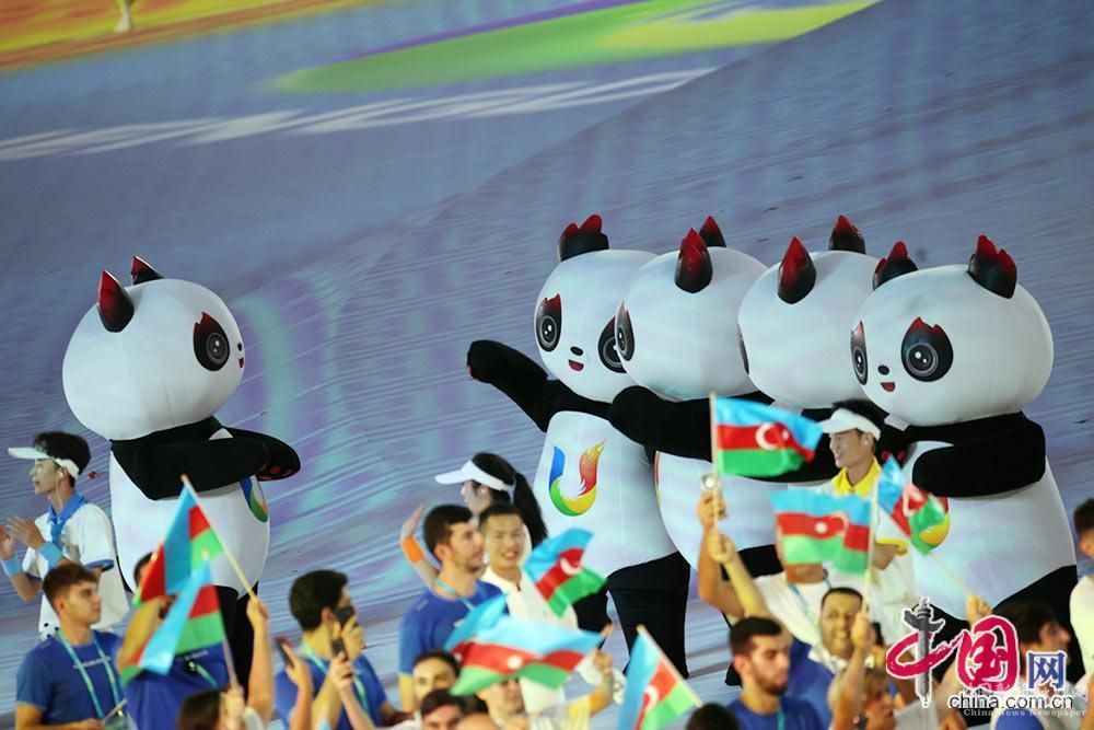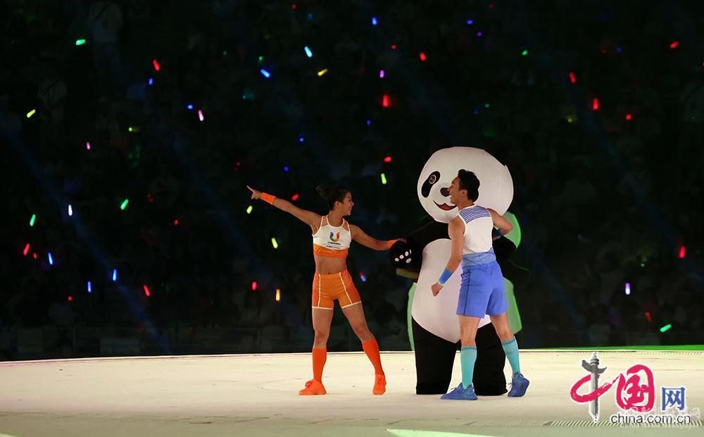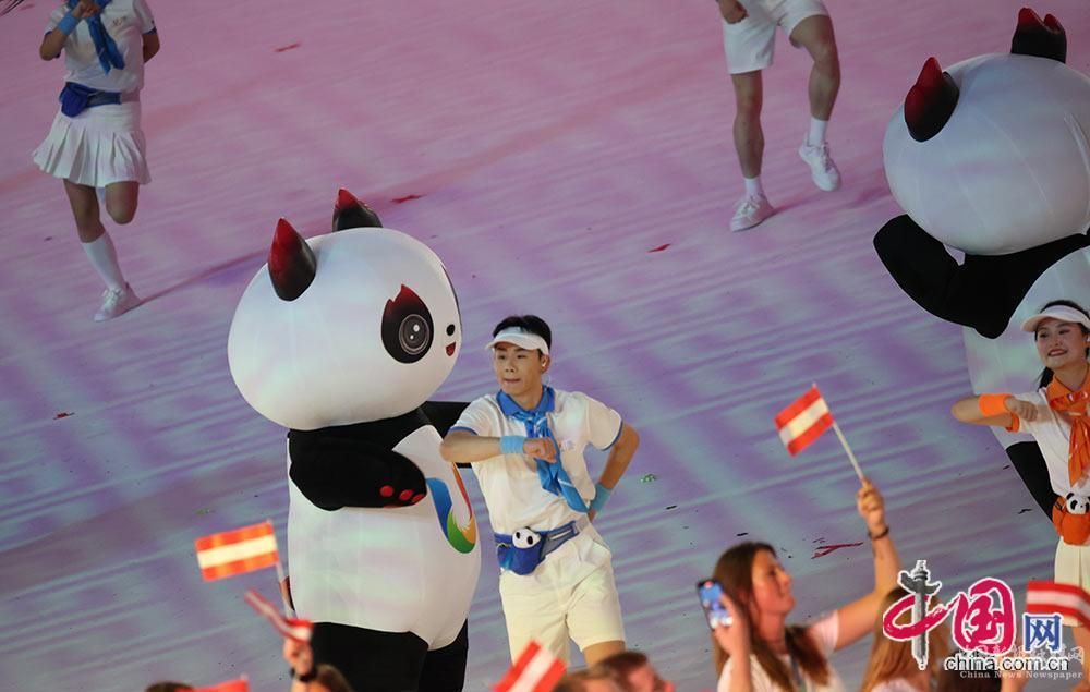7月28日,大運(yùn)會(huì)吉祥物“蓉寶”在第三十一屆世界大學(xué)生夏季運(yùn)動(dòng)會(huì)開幕式現(xiàn)場熱情表演。中國網(wǎng) 倫曉璇攝影