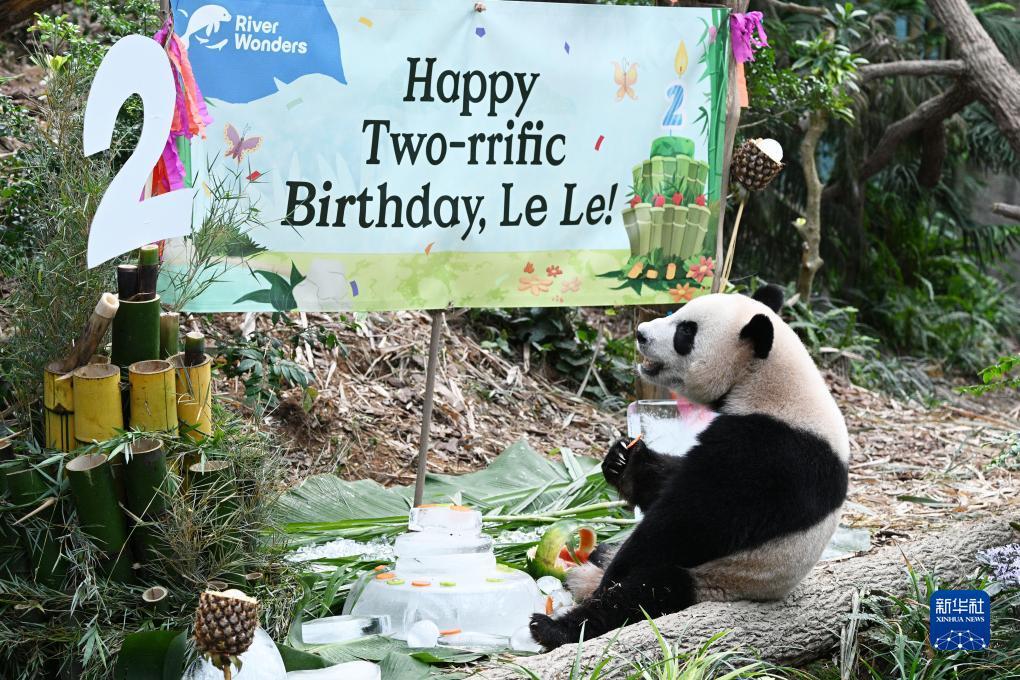 8月14日,在新加坡河川生態(tài)園,大熊貓“叻叻”在兩歲生日慶?;顒由线M(jìn)食。