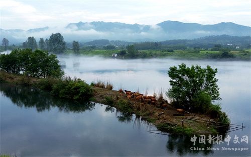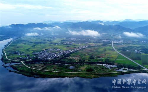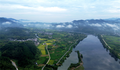 2023年8月27日早晨,航拍下的安徽省宣城市涇縣青弋江涇川段,一彎清水中晨牧的黃牛與遠(yuǎn)近的山嵐、云霧和青黃相間的農(nóng)田交相融合,勾勒出一幅初秋的田園水墨畫卷,令人心曠神怡。(巢志斌 攝)