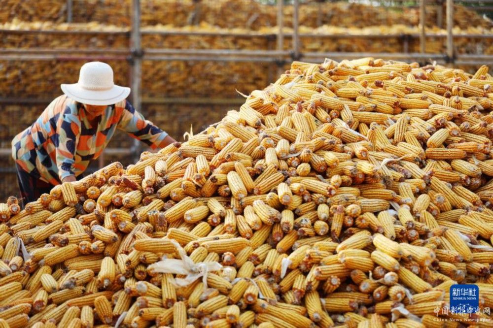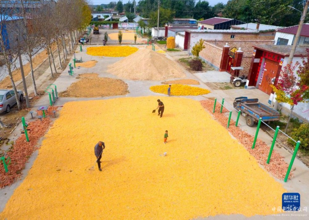 10月9日,河北省晉州市周家莊鄉(xiāng)的農(nóng)民晾曬收獲的玉米(無人機(jī)照片)。金秋時節(jié),各地農(nóng)民搶抓農(nóng)時,有序開展秋收、秋種、秋管等農(nóng)事活動,田間地頭呈現(xiàn)一派繁忙景象。新華社記者 楊世堯 攝