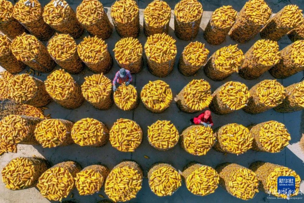 10月7日,在山東省聊城市茌平區(qū)賈寨鎮(zhèn),農(nóng)民在晾曬玉米(無人機(jī)照片)。金秋時節(jié),各地農(nóng)民搶抓農(nóng)時,有序開展秋收、秋種、秋管等農(nóng)事活動,田間地頭呈現(xiàn)一派繁忙景象。新華社發(fā)(趙玉國 攝)