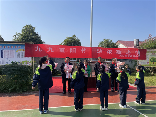 其次,學(xué)校開展了重陽節(jié)經(jīng)典傳承活動,學(xué)生們給退休教師獻(xiàn)禮送花,在活動實(shí)踐中培養(yǎng)他們“尊老、愛老、敬老”的優(yōu)良品德。