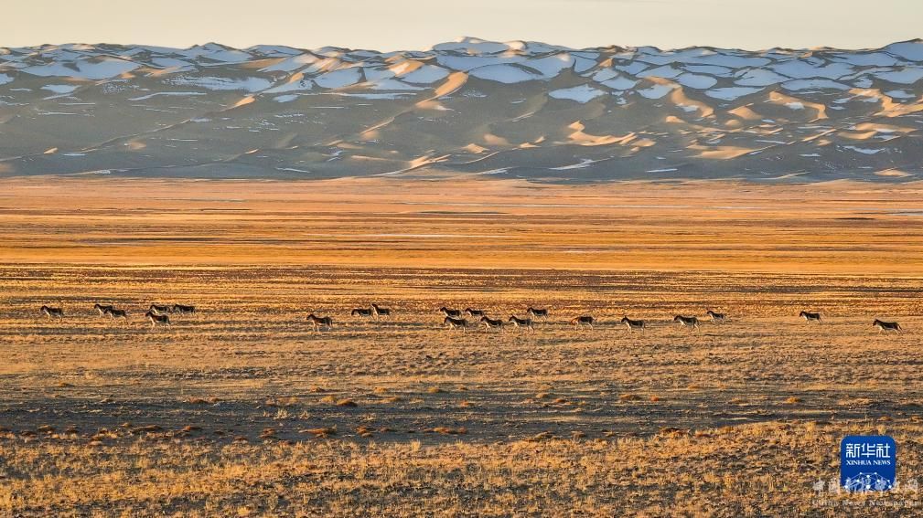 阿爾金山國(guó)家級(jí)自然保護(hù)區(qū),藏野驢在灑滿陽光的草原上奔馳(10月18日攝,無人機(jī)照片)。