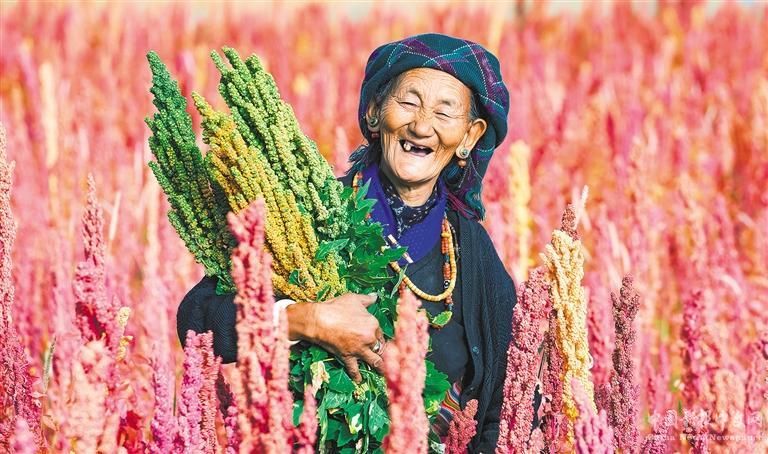 薩迦縣扯休鄉(xiāng)農(nóng)民在展示收獲的藜麥。上海援藏工作組大力開(kāi)展產(chǎn)業(yè)援藏工作,在薩迦縣引進(jìn)藜麥種植,達(dá)到三千畝。鄭忠旭攝(中經(jīng)視覺(jué))