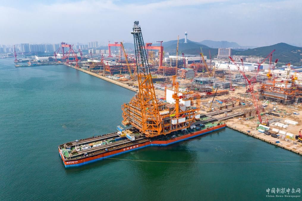 7月10日,渤中19-6凝析氣田Ⅰ期項目中心平臺在青島成功裝船,即將奔赴渤海西部海域,進入海上安裝和聯(lián)調(diào)階段(無人機照片)。