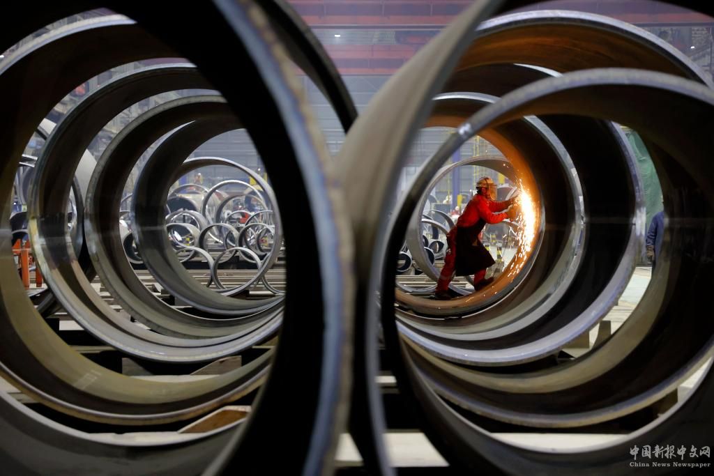 1月13日,在海油工程青島建造現(xiàn)場,工人對工件進行預制工作。