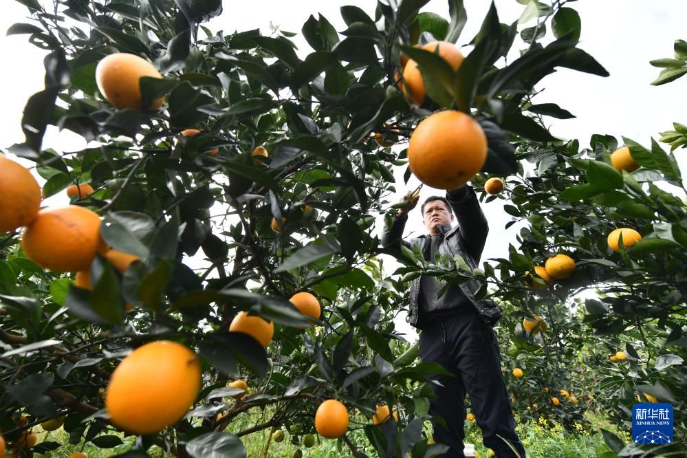 12月26日,在鹿寨縣鹿寨鎮(zhèn)波井村,村民在采收蜜橙。