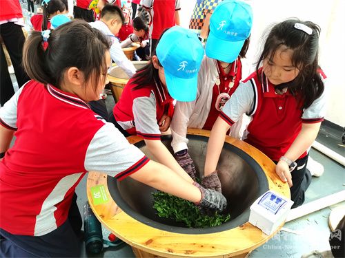 2023年4月19日,谷雨前夕,安徽省合肥市廬江縣湯池鎮(zhèn)白云春毫茶旅研學(xué)基地,來(lái)自合肥市南門小學(xué)的近千名小學(xué)生在老師和工作人員的引領(lǐng)下,學(xué)習(xí)如何炒茶。