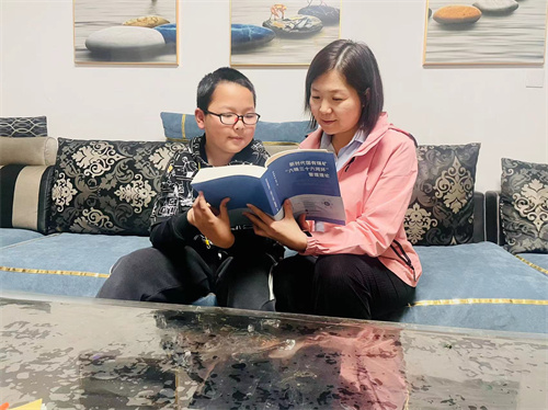 4月23日,雖然是周末,雨后的屋外寒風(fēng)瑟瑟,無法出去玩耍。黨委工作部杭靜蓉的兒子馬一航和她坐在書桌前,一個(gè)提問、一個(gè)在答,書的名字就叫“六精管理理論”。剛上五年級(jí)的他,不理解媽媽為什么要讀這么專業(yè)的書,他時(shí)而會(huì)停下,眼睛望向媽媽,時(shí)而會(huì)用小手在書上撫摸一會(huì),似乎在與書中內(nèi)容進(jìn)行心靈對(duì)話。