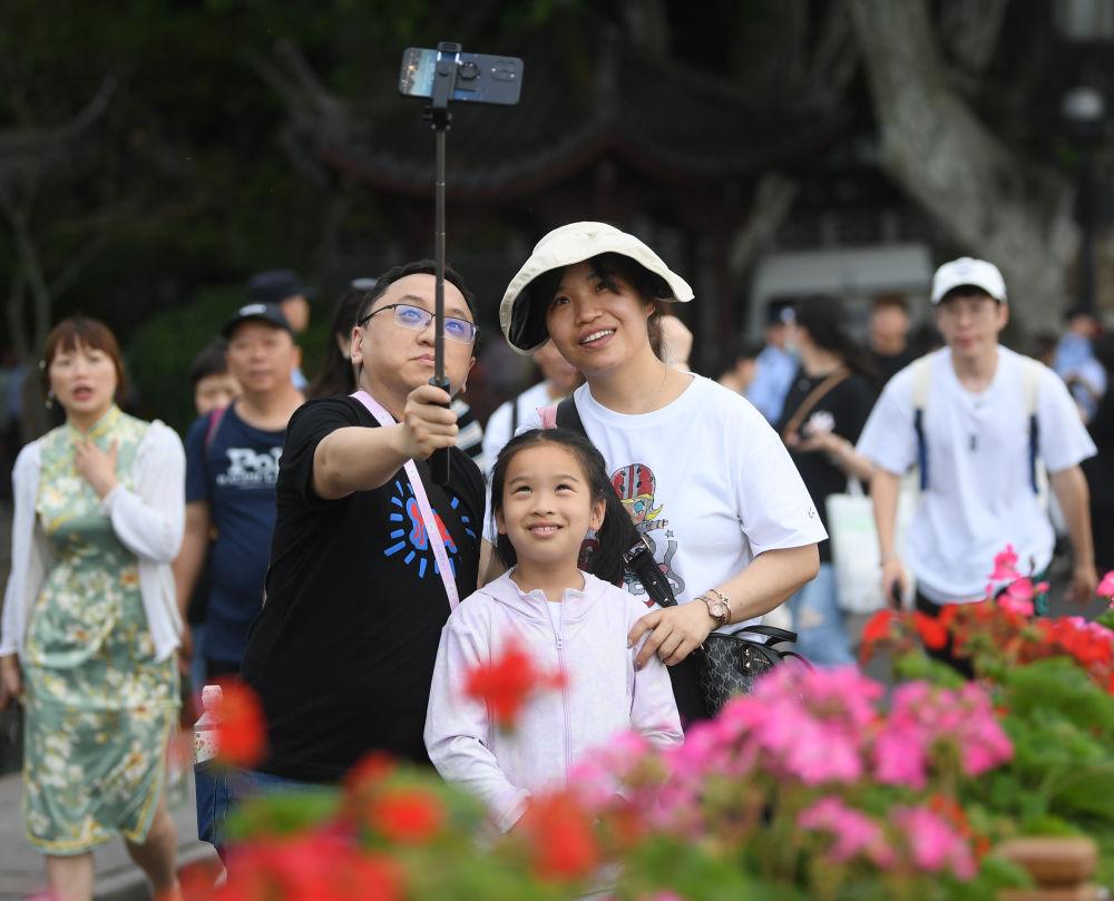 游客在杭州西湖斷橋留影(2023年5月3日攝)。新華社記者 翁忻旸 攝