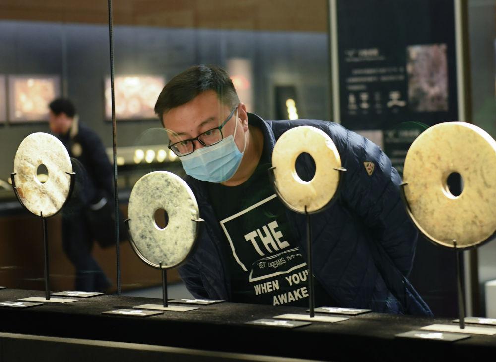 游客在良渚博物院觀看出土的玉璧(2022年3月2日攝)。新華社記者 翁忻旸 攝