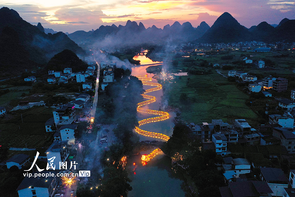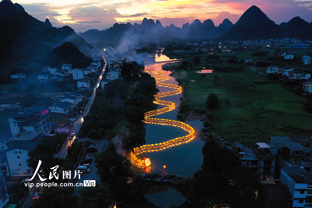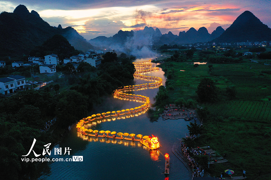 2023年6月18日晚,廣西桂林市陽朔縣白沙鎮(zhèn)遇龍村遇龍河上,一條由55張竹筏組成的550米長的金色“巨龍”巡游,與秀美的山水交相輝映,蔚為壯觀。李忠波攝(人民圖片網(wǎng))