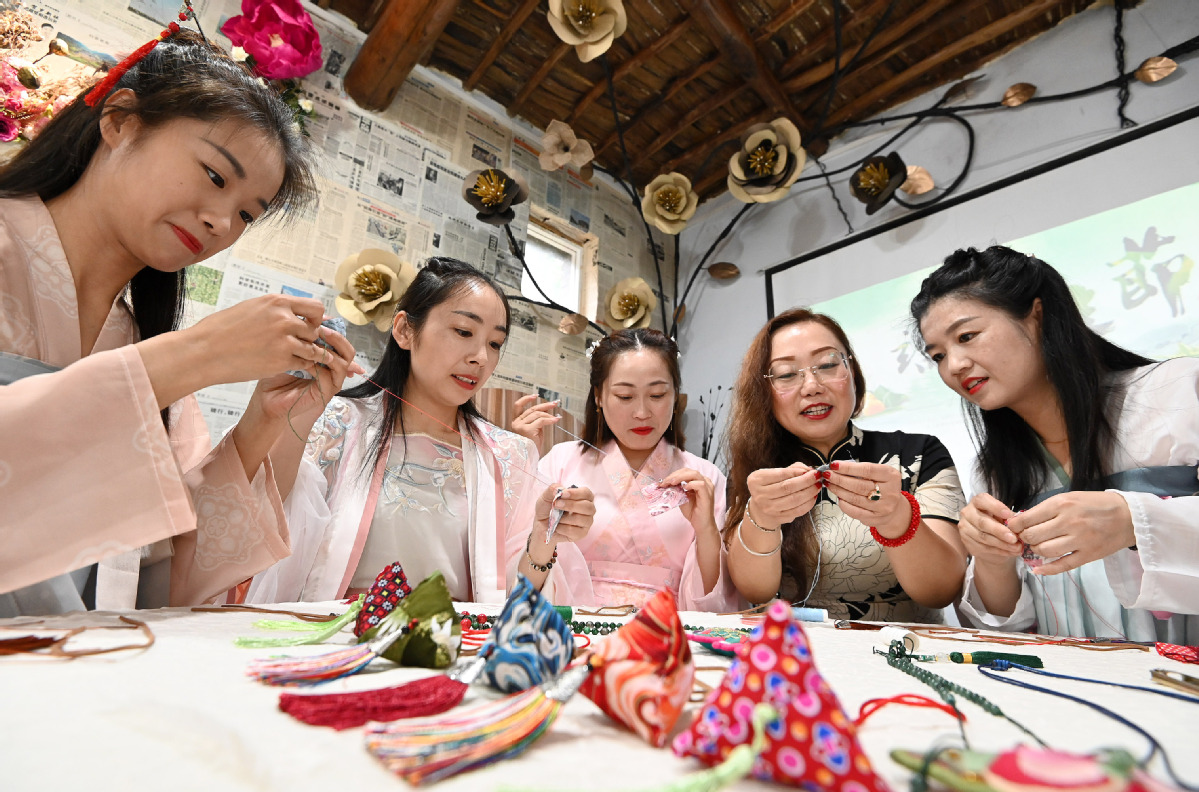 6月19日,河北省邯鄲市峰峰礦區(qū)彭城鎮(zhèn)張家樓村,村民縫制香囊。郝群英 攝
