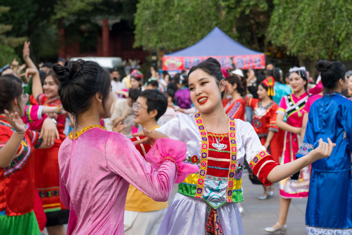 6月17日,新疆維吾爾自治區(qū)烏魯木齊市水磨溝區(qū),市民、游客和演員在端午節(jié)大型文藝匯演中翩翩起舞。孫振嵩 攝