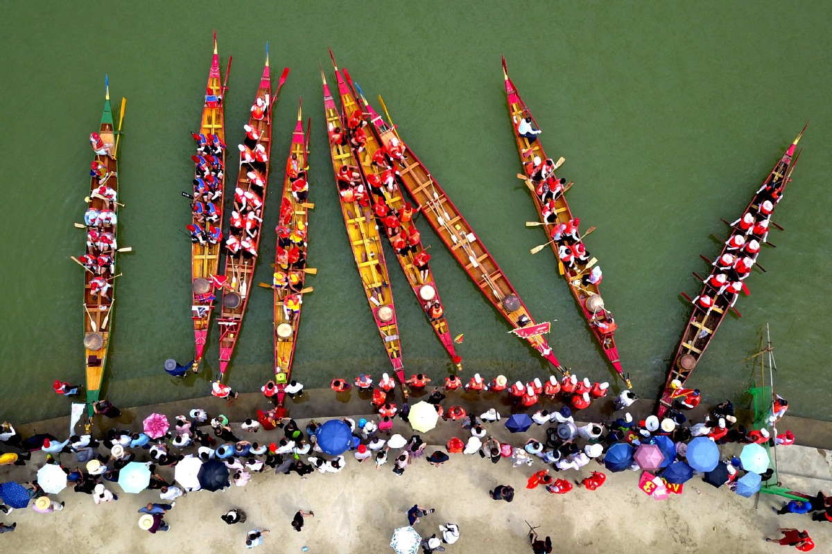 6月19日,湖北省十堰市鄖陽區(qū)漢江水域,龍舟隊集結,準備參加決賽(無人機照片)。曹忠宏 攝