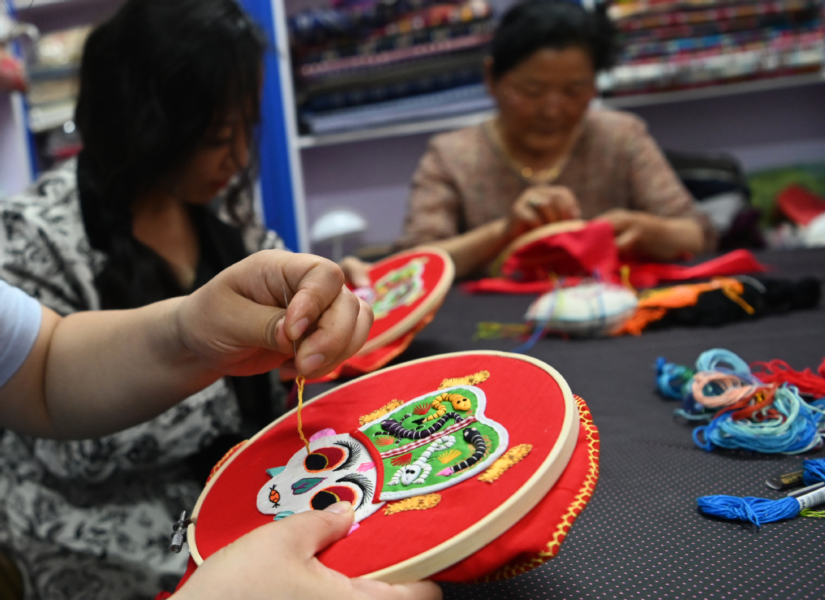 6月19日,山東省聊城市東昌府區(qū)沙鎮(zhèn)鎮(zhèn)張箱村東昌古錦傳習所,村民手工刺繡制作“五毒兜肚”。張振祥 攝