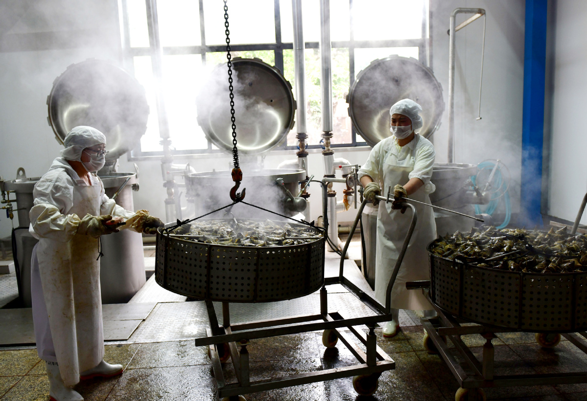 6月14日,湖北省宜昌市秭歸縣一家農業(yè)集團的粽子生產車間,工人搬運煮熟的粽子。王輝富 攝