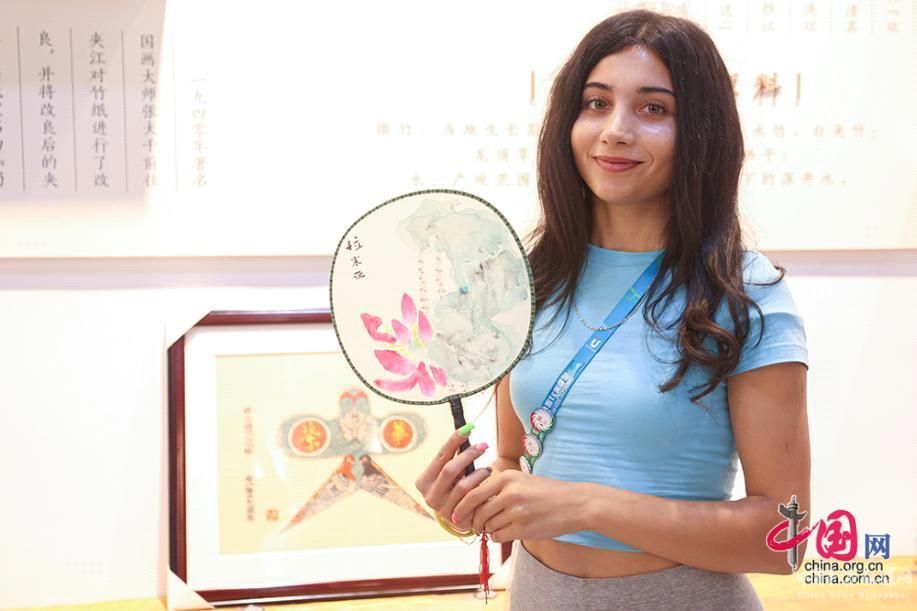 來自阿塞拜疆的運(yùn)動(dòng)員Lamiya Valiyeva與自己的國畫作品合影。中國網(wǎng)記者 倫曉璇 攝