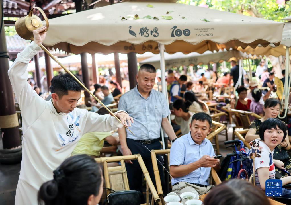 摻茶師傅為客人表演“懸壺高沖”(7月31日攝)。