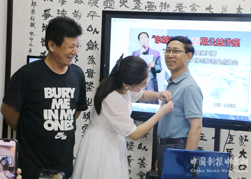 吳月明深耕洞庭湖這片沃土,“洞庭情結(jié)”的文學(xué)創(chuàng)作,碩果累累。鑒于其宣傳推廣“洞庭湖文化”的特殊貢獻(xiàn),現(xiàn)場,洞庭湖文化促進(jìn)會創(chuàng)始人、名譽(yù)會長李良偉代表協(xié)會向其授予“文化大使”稱號,工作人員為其佩戴“文化大使”徽章。