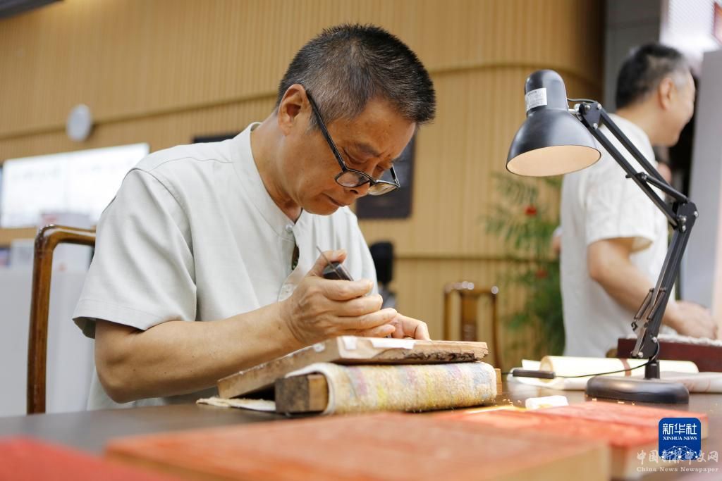 8月22日,在揚(yáng)州市圖書館,江蘇省雕版工藝美術(shù)大師沈樹華在“古籍里的揚(yáng)州運(yùn)河文化”市集上為市民展示雕刻技藝。