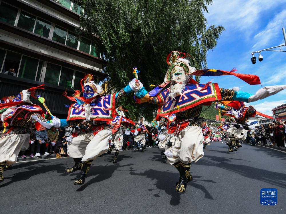 9月15日,在四川省阿壩藏族羌族自治州馬爾康市,演員在街頭表演非遺項目。