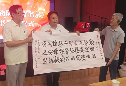 最后,忽培元參事在會(huì)上奉獻(xiàn) 展示了長(zhǎng)幅墨寶“青春長(zhǎng)歌,天地可鑒” 和“賀敬之詩(shī)作”,并傾情賀詩(shī)一首: