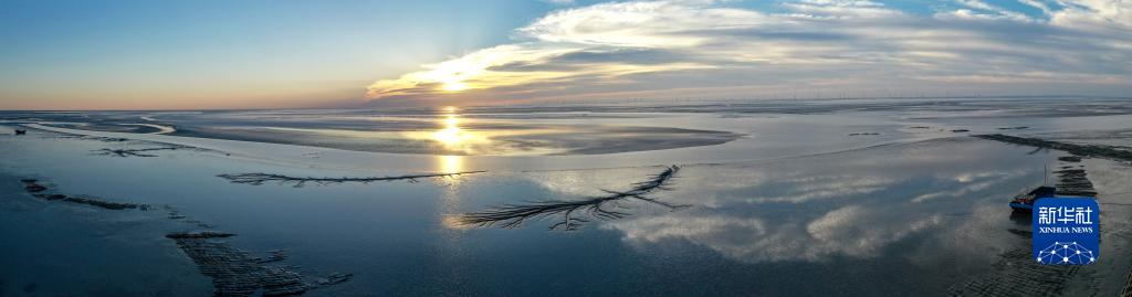 晨曦下的鹽城東臺(tái)條子泥濕地(2023年9月1日攝,無人機(jī)照片)。