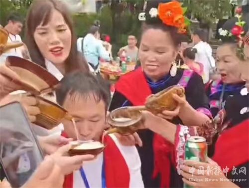 前來參加蘆笙會的黔東南同鄉(xiāng),按照家鄉(xiāng)活動的標(biāo)準(zhǔn),帶來了糍粑、雞鴨、稻谷、布匹等禮物。組委會在進場通道上設(shè)置了多道攔門酒,凡進場來賓,除了孩童和駕駛員,均喝酒通過,以這樣的方式,迎接從各地趕來的同鄉(xiāng)……如此一來,活動現(xiàn)場熱鬧非凡,洋溢著節(jié)日的喜慶氣氛。