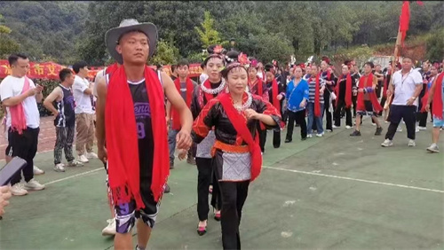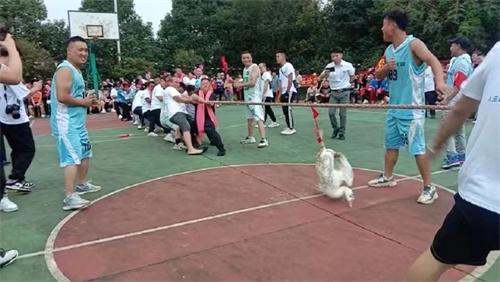 本次蘆笙會,上演的節(jié)日活動有拔河比賽、民族歌曲歌唱大賽、籃球比賽,蘆笙吹奏表演比賽等等。拔河比賽,與以往不同的是,在繩子中間還掛著一只鴨子,誰贏了,鴨子就歸誰享用?;@球大賽冠亞季軍的獎勵,除了獎金外,還有山羊、雞鴨、鵝,很富有創(chuàng)意。